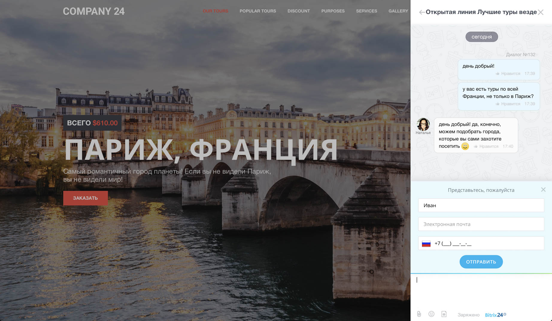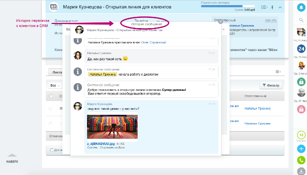 Контакты клиентов и история общения с ними автоматически сохраняются в CRM.